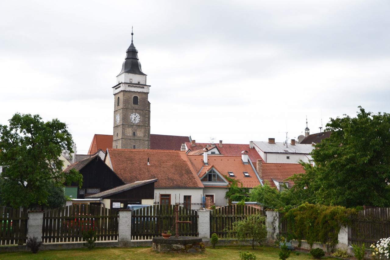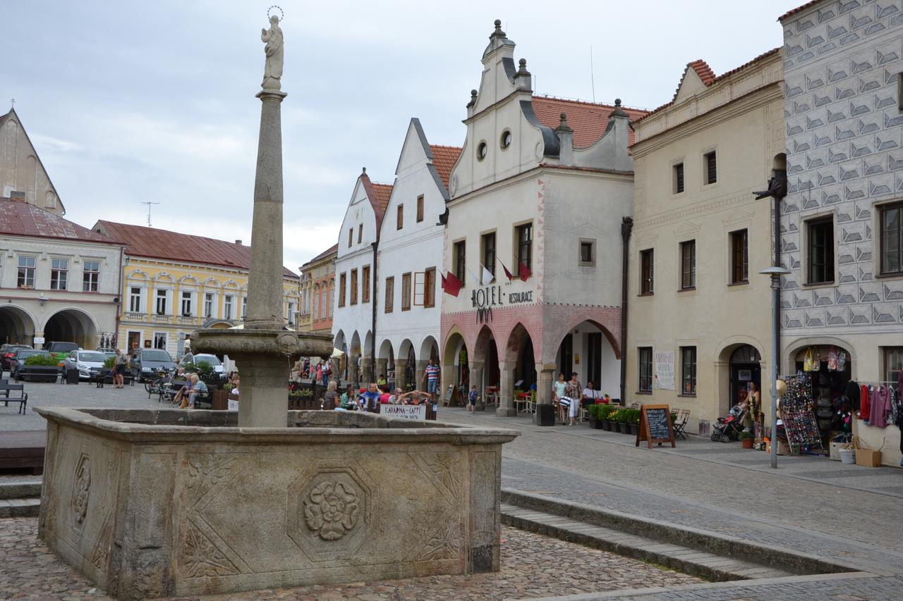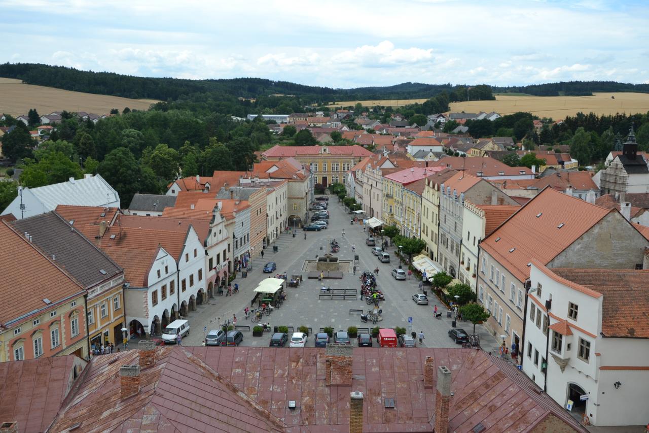 V 1. části tohoto výletu jsem tedy dojel do Slavonic a měl jsem ještě dostatek času si toto město s více než 2.000 obyvateli prohlédnout. I když Slavonice patří pod okres Jindřichův Hradec a tedy do Jihočeského kraje, nacházíme se na Moravě. Historické jádro, není velké, ale pro množství krásných památek je přezdívané „malá Telč“. Ubytovacích možností je zde hodně. Nejen hotely, ale i penziony a různé priváty. Já jsem však na to jedno přespání rozhodně nehledal žádný luxus, a proto jsem si vybral cenově velice dostupný hotel Alfa, který je navíc přímo na náměstí. Odložil jsem kolo a vyrazil na pěší prohlídku. Začal jsem na náměstí Míru, na které navazuje ještě Horní náměstí. Kdo má rád památky, tak pro něj je to zážitek. Renesanční historické centrum s domy s bohatou sgrafitovou výzdobou bylo vyhlášeno městskou památkovou rezervací. Můžeme si prohlížet dům vedle domu, anebo také vylézt na městskou věž kostela Nanebevzetí Panny Marie. Po zdolání 176 schodů se naskytne skutečně nádherný pohled na celé město a okolí.