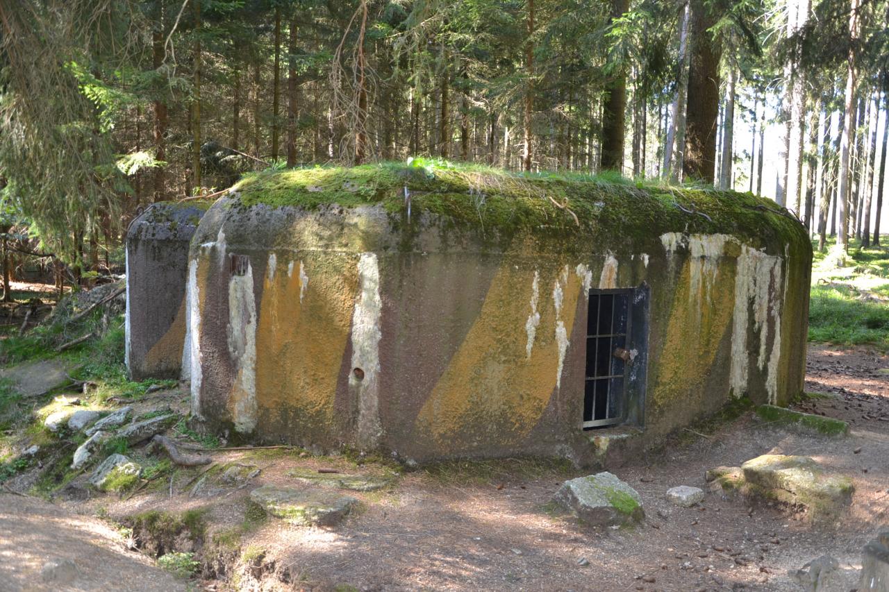 V podhradí je restaurace, polévka 60 Kč, vepřo-knedlo-zelo 160 Kč, smažák bez tatarky 175 Kč, pivo 42 Kč, no ještě, že jsem si ve staroměstském COOPu koupil sekanou s houskou a z domova měl láhev s vodou. Podnikání jsem tedy nepodpořil a jel dál. Pod hradem je malá vesnička Pomezí, zde jsou zbytky strážního hradu a románský kostel, obojí je v soukromém vlastnictví a oplocené, dokonce včetně přilehlého hřbitůvku. Možnost prohlídky zde však za úplatu je. Následuje stoupání, kdy pod Jelením vrchem je nejvyšší místo dnešního výletu – 700 m nad mořem. Vojenské bunkry lemovaly již cestu na Landštejn, ale zde je přímo Muzeum československého opevnění. Bunkry jsou zde jeden vedle druhého a při různých akcích i s možností prohlídky. A ty akce mohou být asi zajímavé, ukázky bojové techniky, zbraní a uniforem, simulace střetu s nacisty, pyrotechnické efekty (více na internetu a facebooku).