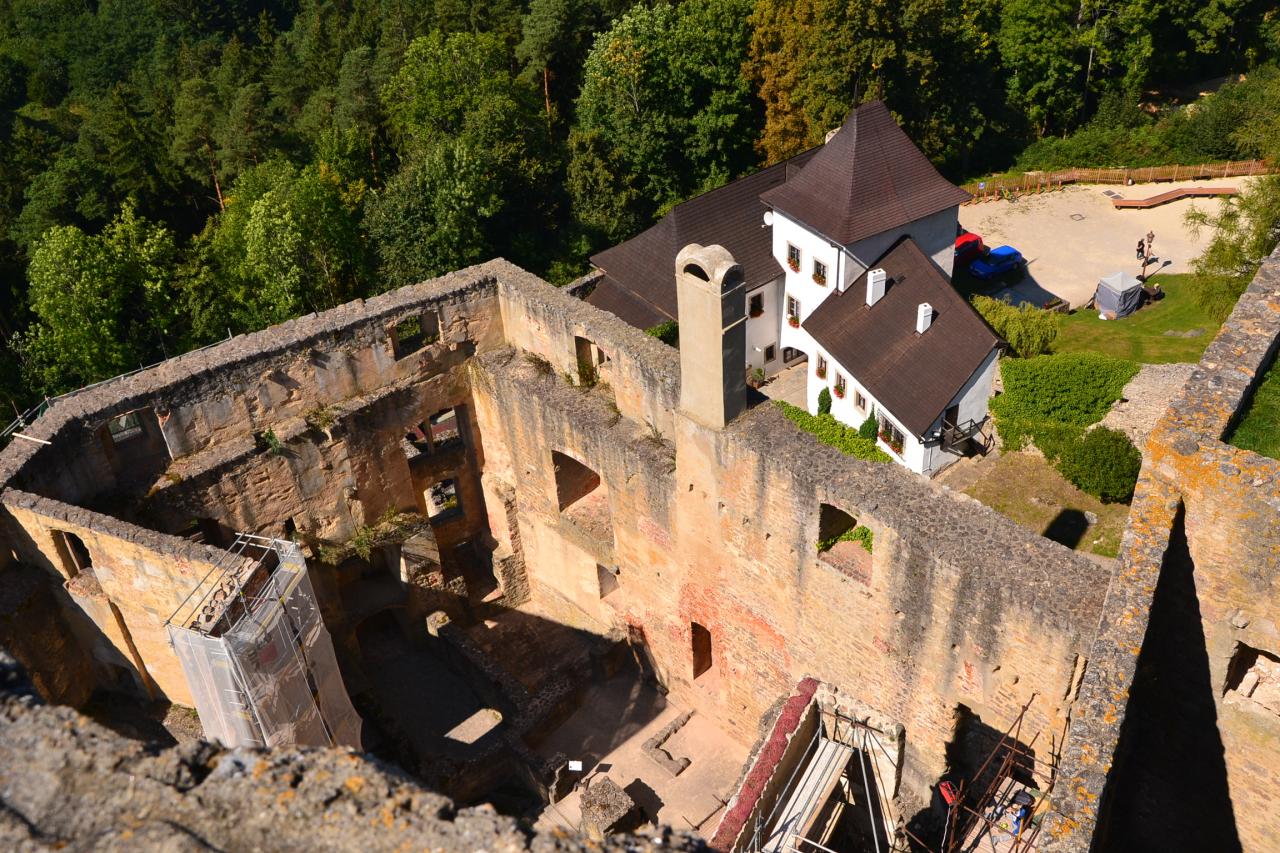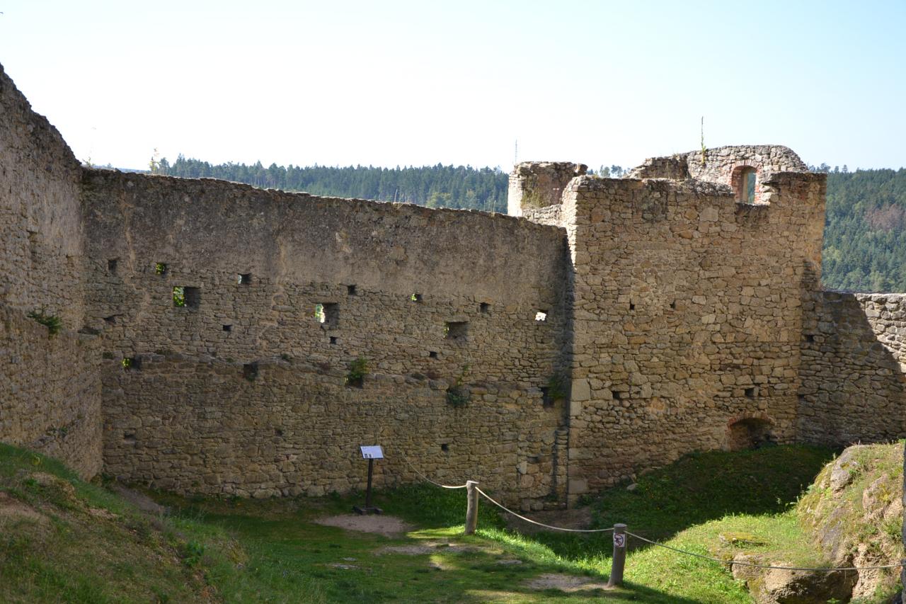 A přede mnou stoupání na hrad Landštejn. Vstupné 100 Kč není nejlidovější na to, že se jedná o zříceninu bez průvodce, ale když jsem viděl všude lešení a pod ním sedět, popíjet a konverzovat skupinu šesti dělníků, řekl jsem si, že třeba není na výplatu a moje peníze přispějí k tomu, aby se zvedli a šli zříceninu opravovat, aby se zcela nezřítila. A skutečně – když jsem se vracel, už pracovali, takže mé vstupné pomohlo dobré věci. Mezitím jsem si přečetl něco z historie a vylezl na věž. Dozvěděl jsem se, že po zestátnění hradu v roce 1945 hrad dále dlouho chátral. Od roku 1961 zde 15 let pracoval dobrovolník Karel Veselý se svými přáteli. Udělali plno práce, ale místo ocenění se spíše dočkali kritiky za neodborné zásahy. Kdo vyleze 50 kamenných schodů a k tomu 150 dalších dřevěných, bude odměněný krásným výhledem po kraji České Kanady, zalesněné kopce vysoké vesměs přes 700 m, sem tam nějaká ta vesnička a přímo pod hradem velká vodní nádrž sloužící jako zdroj pitné vody.