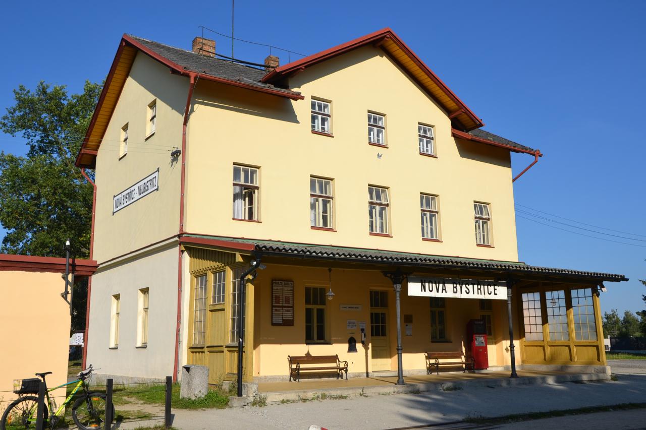 Když jsem neuskutečnil výlet úzkokolejkou do Obrataně, řekl jsem si, že to zkusím opačným směrem – do Nové Bystřice. Ráno po sedmé hodině jsem byl na nádraží v J. Hradci, zde světelná tabule, ale ten můj plánovaný vlak nikde. Podívám se ještě jednou do jízdního řádu, který jsem si vytištěný vzal s sebou a zjistil jsem, že ten vlak jezdí jen o prázdninách, což jsem o týden prošvihnul. Nojo, chybička se vloudila. Kdo má ty malý blešky pod jízdním řádem všechny luštit! Nějak mi ta úzkokolejka není souzená. Co teď? No co, sednout na kolo a vyrazit směr Nová Bystřice. A nakonec jsem tu byl ještě o nějakou tu minutku dřív, než kdybych jel tím vláčkem.
