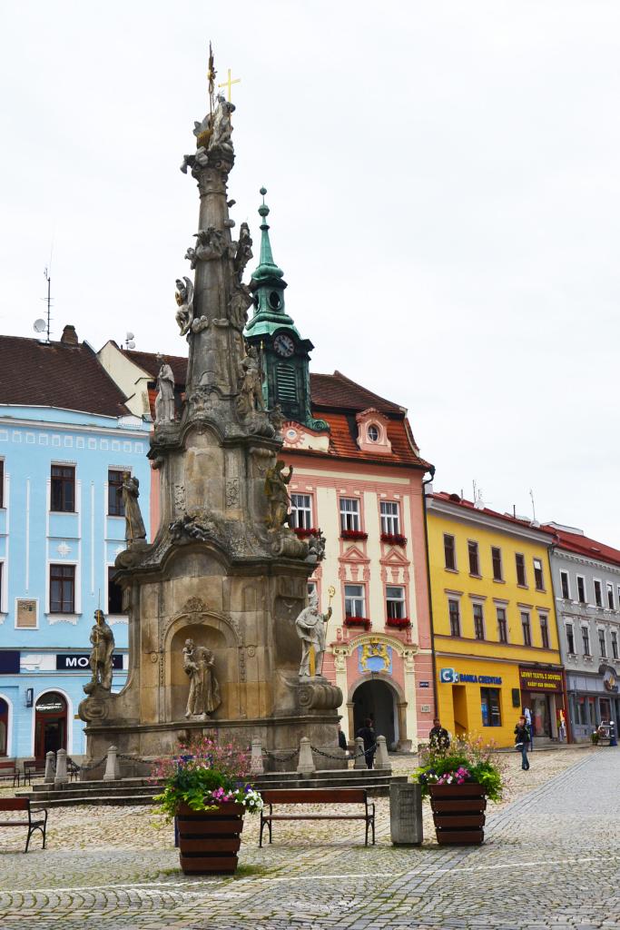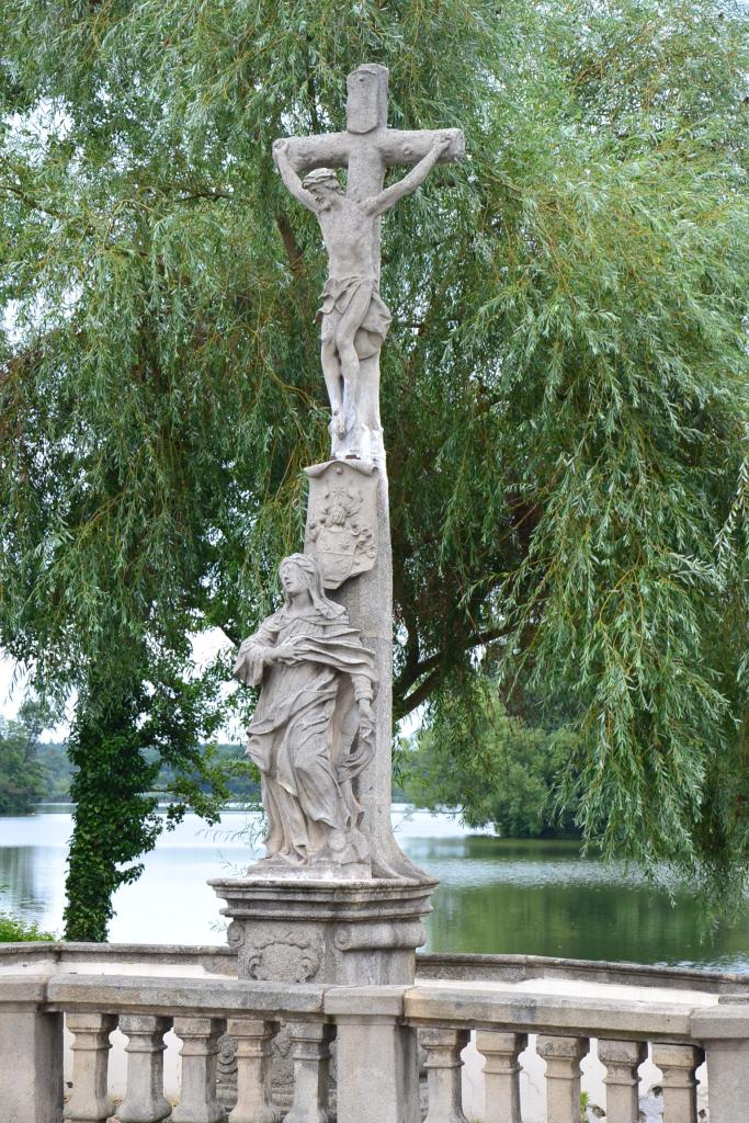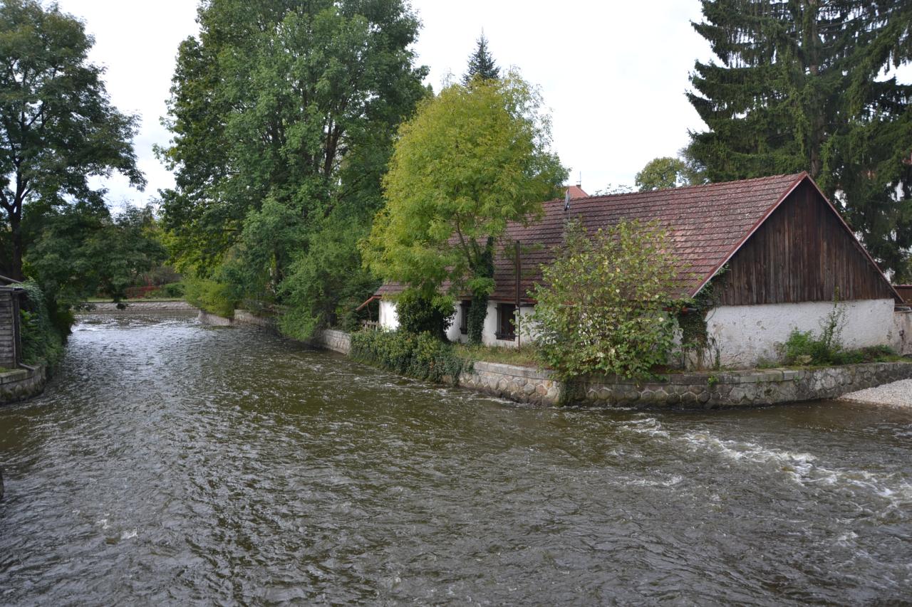 Dobrovského ulicí jsem šel dál kolem muzea (mimochodem zdejší známé Krýzovy jesličky jsou se svými 1400 figurkami největším lidovým mechanickým betlémem na světě), prošel jsem Nežáreckou bránou a vydal se ulicí Pod Hradem. Zde jsem se zastavil jednak při pohledu na městské hradby, malebnou hospůdku u vyústění mlýnského náhonu do řeky Nežárky, starobylého kamenného kříže, gobelínové dílny (dnes speciální škola) s bustou a pamětní deskou zakladatelky českého gobelínu Marie Teinitzerové, ale na druhou stranu jsem byl překvapený několika prázdnými, zpustlými domy, což mi připadalo v této lokalitě podivné. Mezi zámkem a Hamerským potokem, který se o pár metrů dále vlévá do Nežárky, je malý parčík. Je hezky upravený, kaskádovitý, ale na můj vkus je zde, zejména v horní části, pouze trávník a chybí stromy. Kolem Malého Vajgaru, na jehož hladině se krásně zrcadlí okolní domy, jsem prošel opět Dobrovského ulicí na výchozí místo – náměstí Míru, kde jsem si ještě ze všech stran prohlédl 20 m vysoký Mariánský sloup se sousoším Nejsvětější Trojice a další bohatou sochařskou výzdobou.