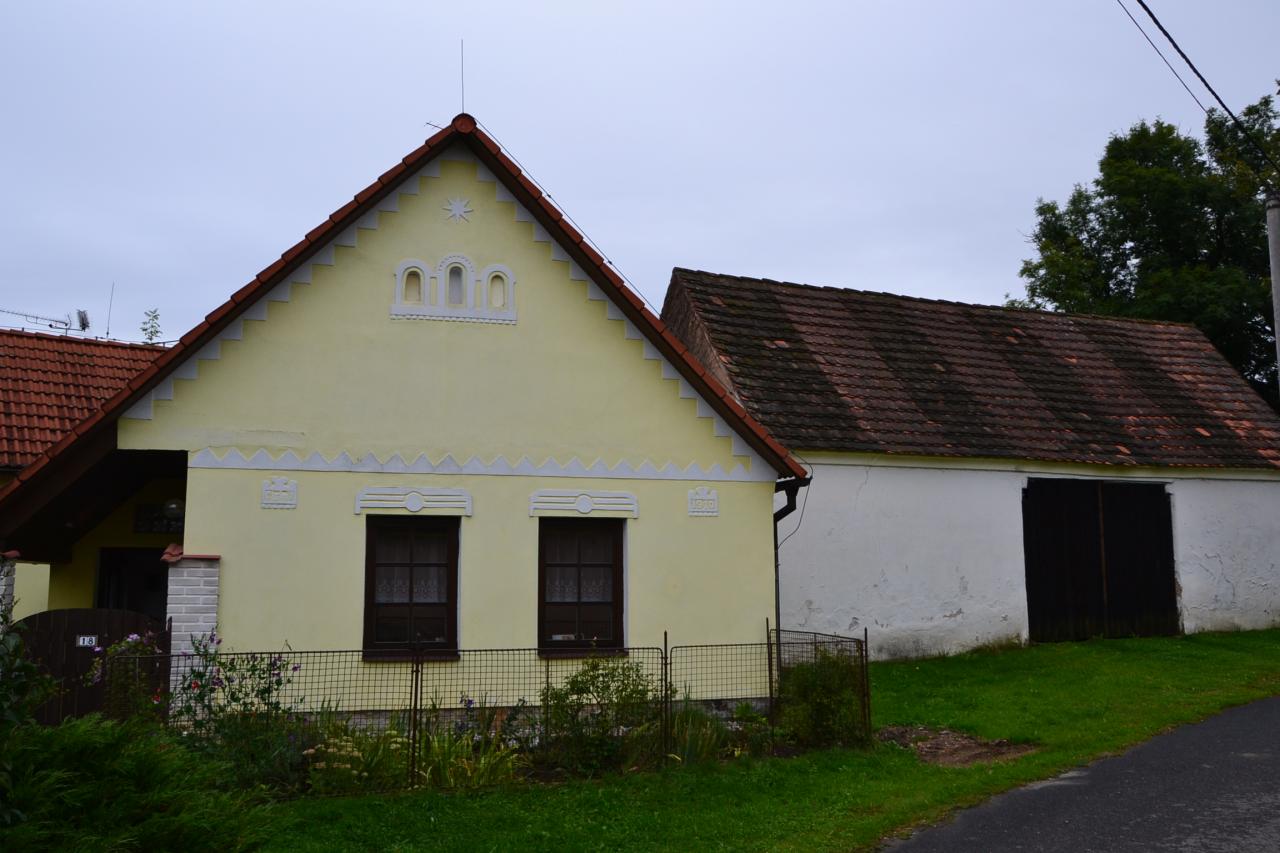 A teď přijde to, na co jsem se nejvíc těšil – vesnička Hrušova Lhota, kterou jsem znal do té doby jen jako tečku na mapě. Něco podobného jako Rosička nebo Mostečný, prostě sem vede silnice a zde končí. A zklamaný jsem rozhodně nebyl. Nádherná vesnička s cca 50 stálými obyvateli, náves se soustavou rybníků, kapličkou a řadou starých, ale udržovaných domů a všude překvapivě nové asfaltové cesty. A především klid, který objevili hlavně chalupáři. A pak je zde také několik starých kamenných křížů, což mě vůbec na této cestě zaujalo. Zatímco v okolí Deštné vídáme křížky menší, převážně litinové, tak od Dírné člověk potkává naopak opravdu masivní kamenné kříže. Z Hrušovy Lhoty se polní cestou (pěkný výhled na Choustník) dostaneme do Třebějic. Před Třebějicemi je zajímavá obora Rokle, kde můžeme při troše štěstí zahlédnout daňky. Nad oborou je výklenková kaplička a přímo v Třebějicích kromě několika zajímavých venkovských domů a romantického návesního rybníku je kaple sv. Jana Nepomuckého. No a z Třebějic si vyšlápneme kopec a pak už frčíme do Dírné, kde se nezapomeneme stavit u legendy Marcilise, který zde již od roku 1992 točí stále jednu značku piva a to Budvar. Takže tento starší pán a ten Budvar, to jsou takové dvě jistoty. Mimochodem, věděli jste, že tento dům byl kdysi klášterem?