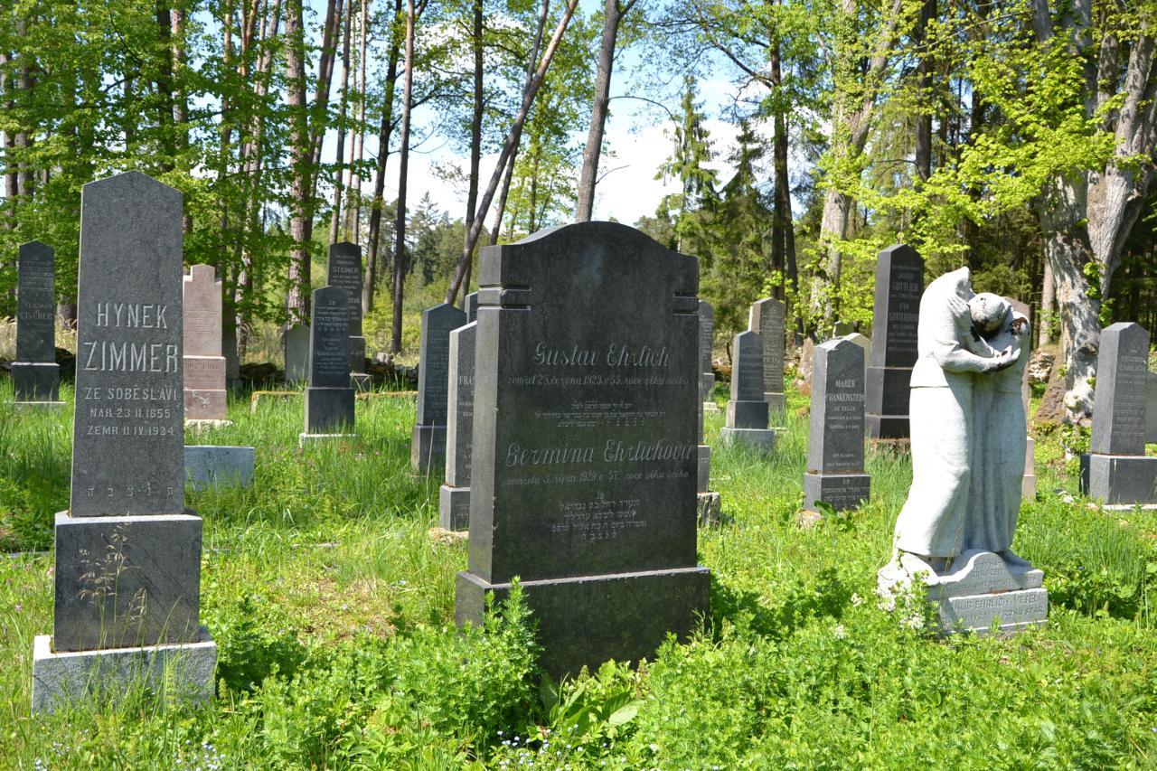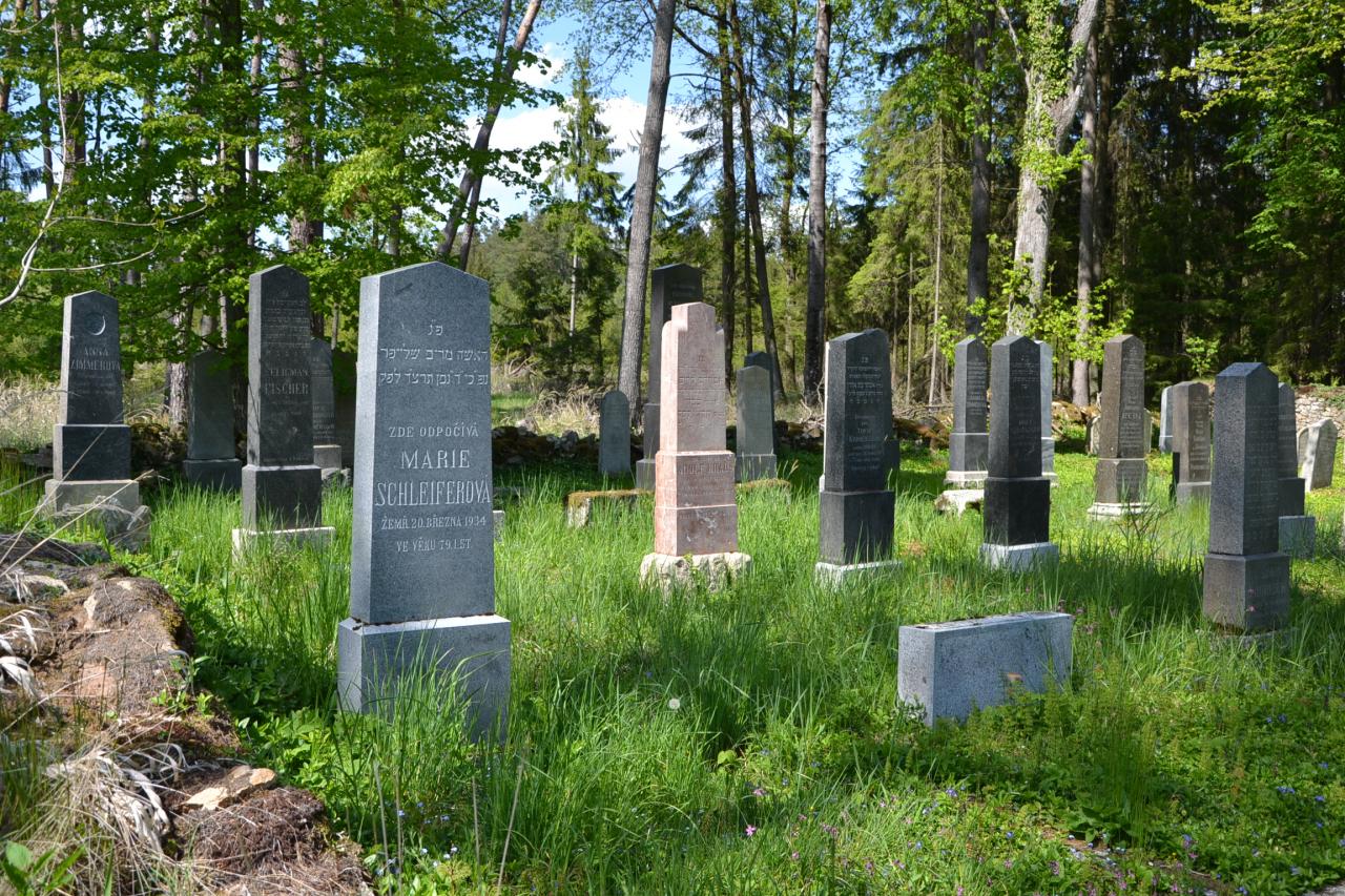 Další mojí zastávkou byl Přehořov. Já jsem Přehořov dříve nějak neznal, ležel mimo mé cesty, ale v poslední době, když jsem tudy projížděl, jsem si vždy všiml dvou sloupů, jakoby brány a za nimi začínající aleje, tak jsem to chtěl prozkoumat. A skutečně nejen dlouhá lipová alej, ale zbytky celého anglického parku. A tak jsem se dozvěděl, že zde byl kdysi rozsáhlý zámek s parkem a skleníkem, který byl jako dokonale zdevastovaný koncem minulého století zbořen. Takže to někteří čtenáři určitě pamatují, mně to nějak uniklo. O něco později byly zbořeny i hospodářské budovy, z nich se ještě dochovaly velké sklepy, do kterých je možné se od silnice podívat. Stejně tak se v Přehořově nedochoval bývalý pivovar, ani židovské ghetto. Proti vchodu do parku je ještě pozůstatek lipové aleje. Tudy se po 200 m dostaneme k hezkému kostelu sv. Anny. Když se z vesnice dáme po žluté turistické značce směr Lžín a odbočíme na okraji lesa doprava, tak se po 500 m dostaneme k starému židovskému hřbitovu, který má pro mě řadu zajímavostí. Nejen, že leží hodně stranou v lese, ale zatímco jinde narážíme na vysokou zeď a mnohdy je problém se na hřbitov dostat, tak zde jsou již jen zbytky zdi. Na jiných židovských hřbitovech všude přítomný břečťan zde nahrazuje brčál barvínek a uprostřed hřbitova je tůňka a sousoší s uraženou hlavou. Zatímco jinde kromě hebrejských nápisů převažuje němčina, tak zde je hodně náhrobků českých. A pokud by někoho zajímalo, kde odpočívá Král Šalamoun nebo Frankenstein, tak vězte, že jejich náhrobky jsou k vidění právě tady.