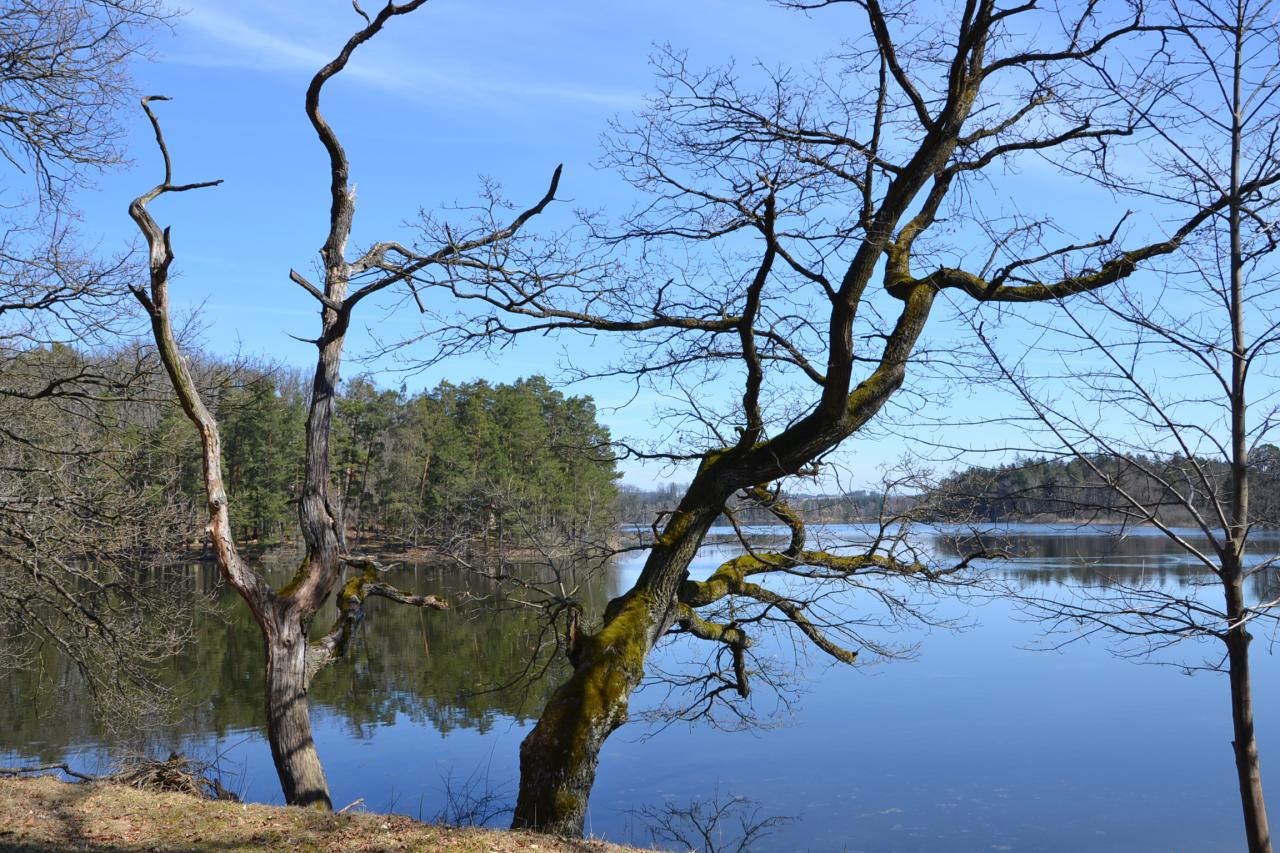 Dojedeme až k rybníku Holná, který je se svými 245 ha největším rybníkem na Jindřichohradecku. Původní rybník byl mnohem menší a starou hráz můžeme vidět pod tou, po které nyní jedeme. V rybníku je ostrůvek Naxos, přírodní biosférická rezervace. Od Holné pojedeme Evženovým údolím (název po hraběti Eugenu Černínovi) Vydýmačskou cestou. Všechny lesní cesty zde mají své jméno a protkávají území o rozloze 2.000 ha až k Jemčině. Jedná se o 33 rovnoběžných a 22 příčných cest, které sloužily k jelením štvanicím pro vrchnost z celého Českého království. V dolní části Evženova údolí u rybníka Vydýmač je nejen známá restaurace Pecák (nyní v covidové době bez jediného turisty), ale především Černínská lesní kaple z roku 1898. Odtud pokračujeme po žluté turistické značce, ale neděláme oblouk až k řece Nežárce, naučná stezka cestu zkracuje, aby nás dovedla k místu, kde hejtman Pušperský vyměřil 60 ha rybník Karštejn, který se však potýkal s problémem prosakující hráze, postavené z místní písčité zeminy, a také nedostatkem vody. Po 300 letech byla hráz prokopána a rybník zalesněn. Opět navážeme na žlutou značku a posléze na asfaltovou cestu a míjíme dva prastaré, již dosti proschlé duby s obvodem kmenů 6 m a druhý dokonce přes 7 m. Duby zde nacházíme na hrázích všech rybníků, vysazovaly se pro svůj mohutný kořenový systém ke zpevňování hrází.