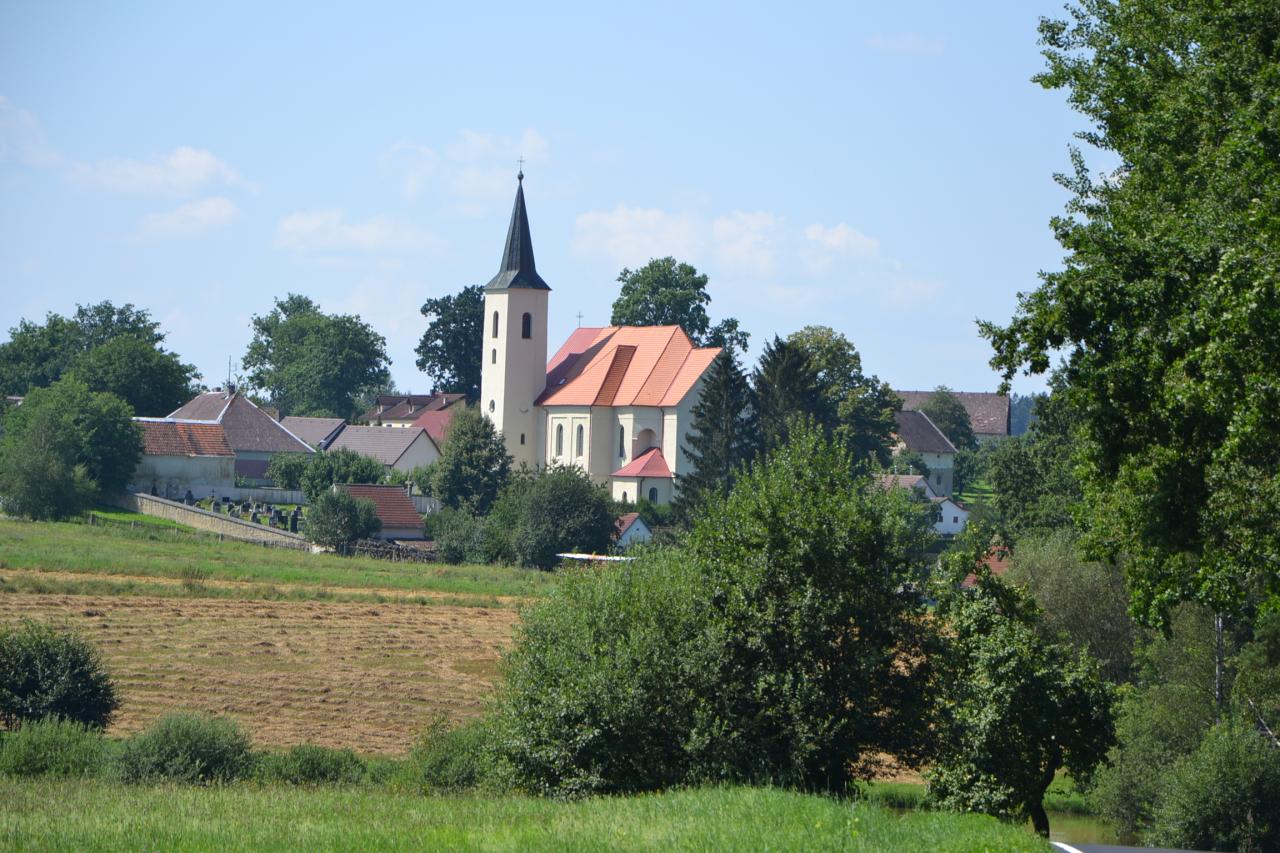Dále pokračujeme po cyklotrase číslo 1242 kolem rybníka Lihovar až do Hospříze, kde je zajímavý pomník: Na památku znovuosídlení Hospříze českými lidmi. Cyklotrasa vede dále hezkou krajinou do mírného kopce po málo frekventované, dlouho neopravované silnici plné výmolů, až zkřížíme červenou turistickou značku a po ní dojedeme k Ratmírovskému rybníku. Kvalita vody, ani samotný přístup do ní mě však nelákaly a také ani nikdo jiný ve vodě nebyl. Přitom je to zde hodně turistické místo, ale lidé raději vysedávali u svých chat a na terase hospody. Snědl jsem tedy svůj svačinooběd, projel se kolem břehu, u penzionu Ratmírák jsem se otočil a přemýšlel, jak dál, protože po červené značce se cesta zdvíhala přes kořeny stromů do lesa a navíc se jednalo o druhý konec Jindrovy NS a s Jindrou už jsem měl špatné zkušenosti. Tak vyhrála pohodlnost a jel jsem po zbrusu nové asfaltce, dvakrát jsem přejel úzkokolejku a byl jsem v Blažejově.