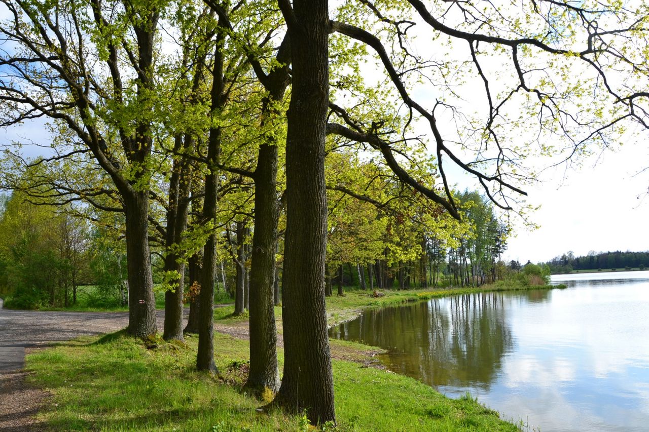 Z Deštné pojedeme do Lodhéřova. Pěkně po silnici, žádný experiment, protože dříve sjízdná cesta od benzinky přes Hátu dále po červené je dnes tak rozježděná a zarostlá mladými, místy popadanými stromy, že je těžko schůdná i pěšky. Cestu si však dále zpestříme odbočkou na Drahýšku. Zde je vedle kapličky šestiboký památník Černínského statku, na kterém jsou popsány úspěchy v letech 1918 – 1937. Zajímavé čtení. Dále pojedeme kolem rybníka Velký Hroch, který nás zaujme nejen velkou vodní plochou (44,4 ha, tedy asi jako 13,5 našich Voleských rybníků), ale i stromořadím mohutných dubů.