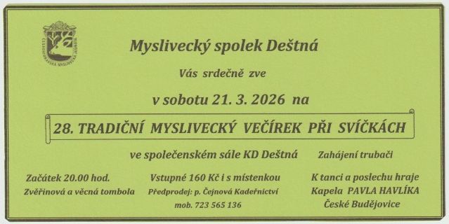 Tradiční Myslivecký večírek při svíčkách. K tanci a poslechu hraje kapela Pavla Havlíka z Českých Budějovic. Čeká vás zveřinová a věcná tombola. Předprodej v kadeřnictví Jany Čejnové - tel. 723565136.