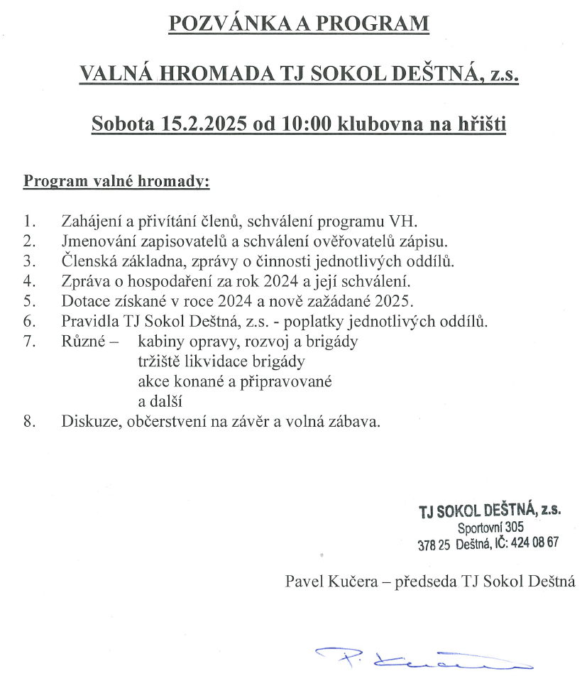 Valná hromada TJ Sokol Deštná, z.s. se koná 15. února 2025 v klubovně na hřišti. Program zahrnuje přehled činnosti oddílů, zprávu o hospodaření a plán na rok 2025. Součástí akce je diskuze, občerstvení a volná zábava. Účastníci budou diskutovat o dotacích, pravidlech a rozvoji klubu.